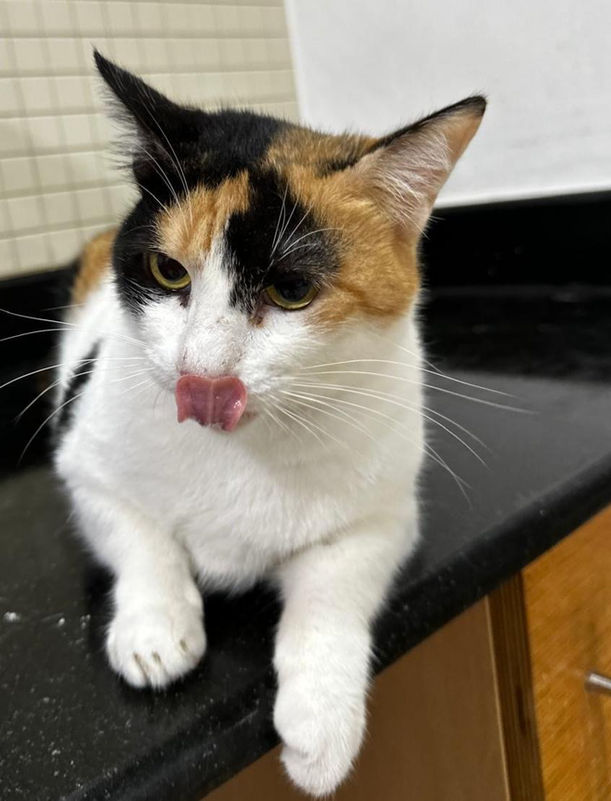Celien has been waiting far too long for a home to call her own. This beautiful calico girl was found in her rescuer’s work area on the streets of Bahrain. She was wary of humans, making it difficult for her rescuer to catch her, and in that time, she gave birth to several litters of kittens—tragically, many didn't survive. Through patience, kindness, and daily feedings, her rescuer slowly gained her trust.